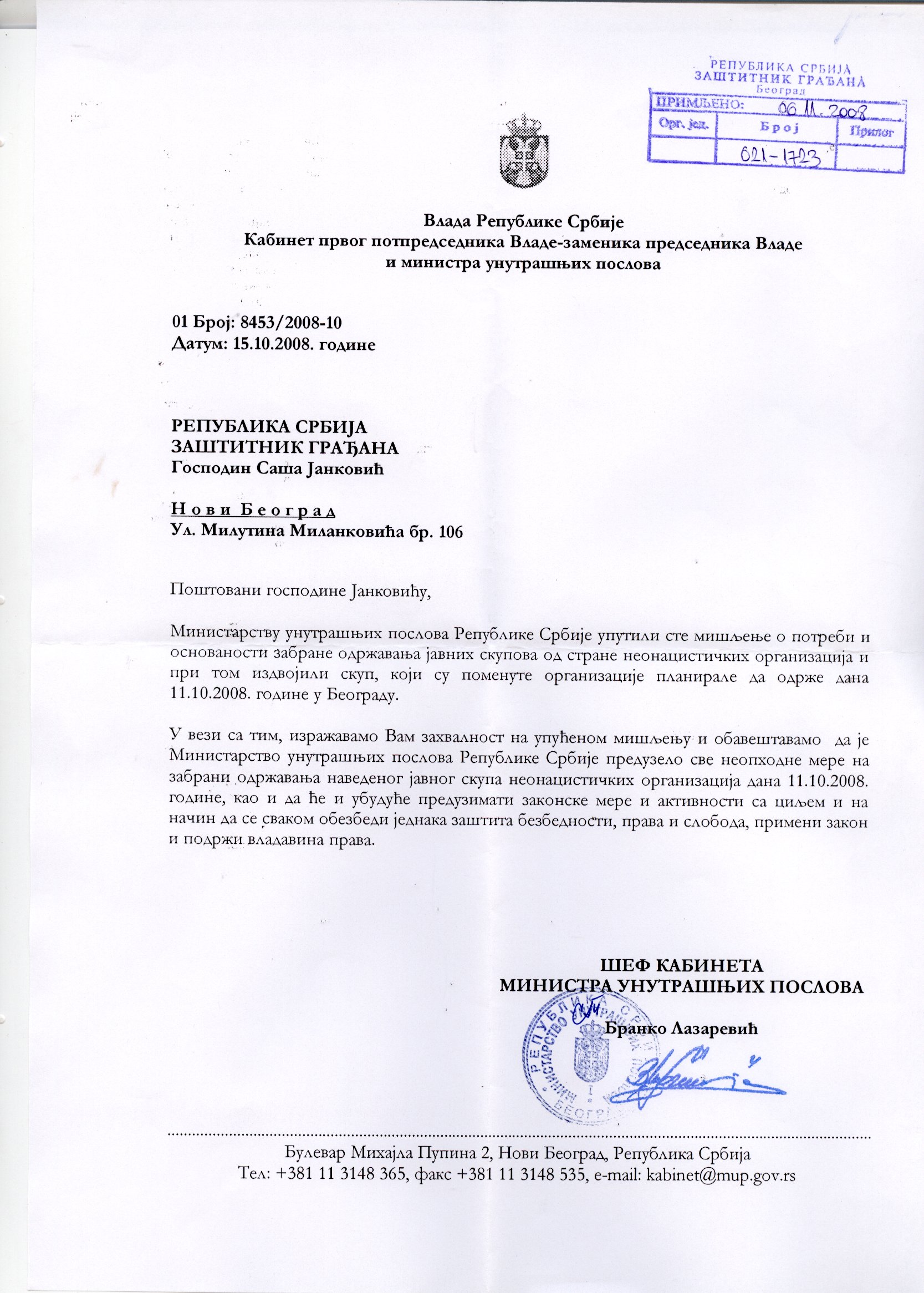 Мишљење Министарству унутрашњих послова Републике Србије поводом најаве одржавања јавног скупа неонацистичких и сличних организација Мишљење Министарству унутрашњих послова Републике Србије поводом најаве одржавања јавног скупа неонацистичких и сличних организација Attachments: Одговор Министарства унутрашњих послова Републике Србије Мишљење МУП-у РС поводом најаве одржавања скупа неонацистичких организација